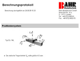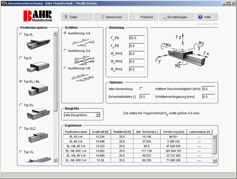 Es können verschiedene Positioniersysteme und Baugrößen ausgewählt werden. Nach Vorgabe der am Schlitten wirkenden Kräfte und Momente werden die auf die Laufrollen bzw. Schienenführungen wirkenden Belastungen ermittelt und die Sicherheiten sowie der mögliche Verfahrweg bei vorgegebener mittlerer Geschwindigkeit berechnet. Die Ergebnisse werden übersichtlich in einer Tabelle dargestellt. Ein Berechnungsprotokoll kann ebenfalls ausgegeben werden. Die Berechnungen können gespeichert und wieder geladen werden.