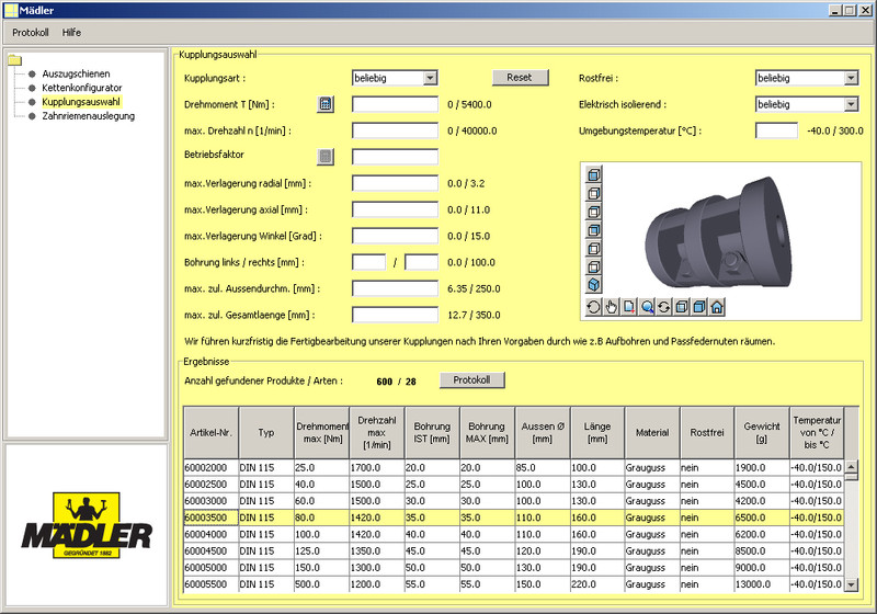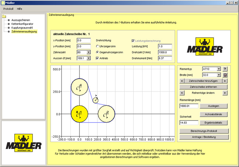In Folgeprojekten wurden weitere Softwaremodule für die Auswahl von Kupplungen und Auszugsschienen sowie ein Kettenkonfigurator realisiert. Diese Softwaremodule wurden dann gemeinsam mit der Zahnriemenberechnungssoftware unter einer gemeinsamen Oberfläche zu den Mädler-Tools zusammengefasst.mehr...
