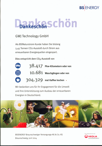 Bereits seit 2011 nutzen wir ausschließlich Strom aus erneuerbaren Energien und leisten damit auch einen Beitrag zum Klima- und Umweltschutz. So konnten wir bislang 5.45 Tonnen CO2-Ausstoß einsparen.
