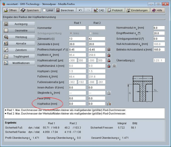 In allen eAssistant-Modulen für Stirnradverzahnungen (Einzelrad, Stirnradpaar, Planetenstufe, Räderkette, Zahnstange) kann jetzt, alternativ zum Kopfkantenbruch, eine Kopfabrundung vorgegeben werden. Diese kann entweder analog dem Kopfkantenbruch als Radialbetrag oder direkt als Radius definiert werden.