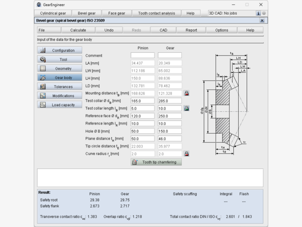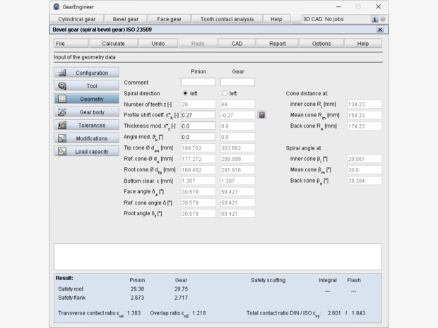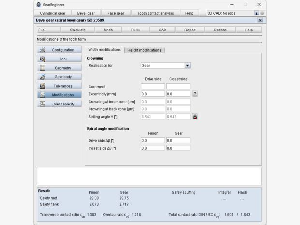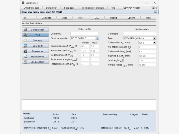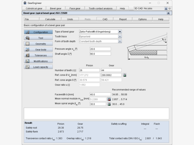 The software module enables the calculation and optimization of the precise tooth geometry of spiral bevel gears. Currently, Klingelnberg’s Zyklo-Palloid® system is supported. The module calculates the exact tooth form and determines the gear geometry according to ISO 23509 and KN 3028, as well as the load capacity in accordance with ISO 10300.