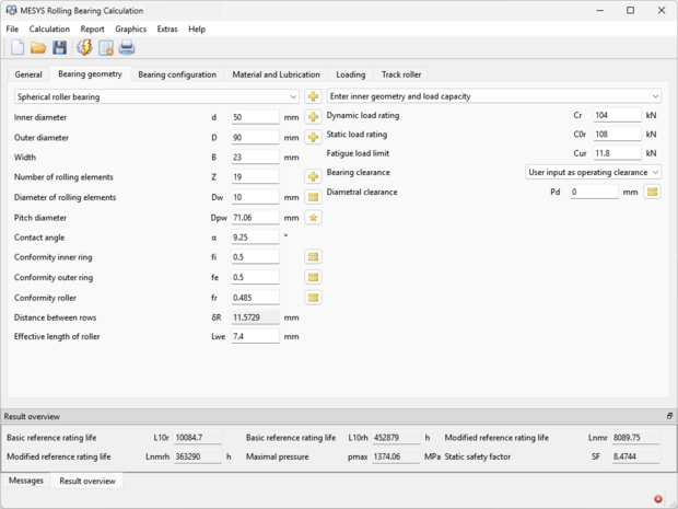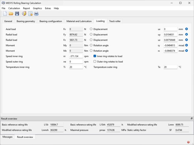 The inner geometry of the rolling bearing is provided by the user, but it can also be approximated from the load capacities by the software. The calculation returns the pressure distribution between the rolling elements and the reference life according ISO/TS 16281 for a given loading (force and moment or tilting).