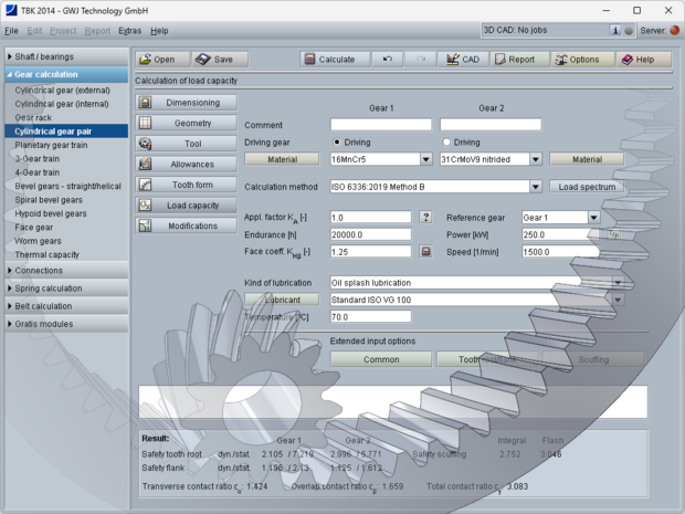 Calculations are primarily performed in accordance with standards such as DIN, ISO, and AGMA.