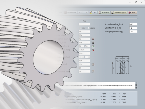 Im Berechnungsmodul für außenverzahnte Stirnräder in der webbasierten Software eAssistant sowie in der TBK-Software von GWJ Technology wurde der Eingabebereich für den Eingriffswinkel erweitert.