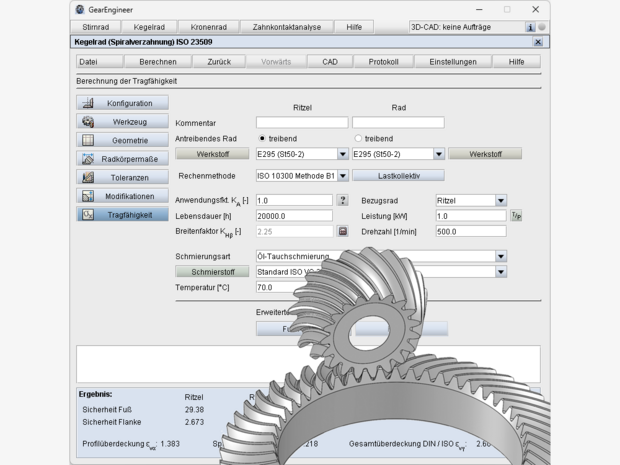 Der GearEngineer ist eine leistungsstarke und intelligente Software zur Berechnung von verschiedenen Zahnradtypen. Der Fokus des GearEngineer liegt auf der Berechnung und Ausgabe der exakten 3D-Zahnform komplexer Verzahnungen. Diese dient als Ausgangsbasis für alternative Herstellungsmethoden, wie die Fertigung der Zahnräder auf Universal-Mehrachsbearbeitungszentren. Darüber hinaus stehen auch Berechnungsmethoden nach DIN und ISO für die Tragfähigkeitsberechnung von Verzahnungen zur Verfügung. Weiterhin ist auch eine Zahnkontaktanalyse integriert.