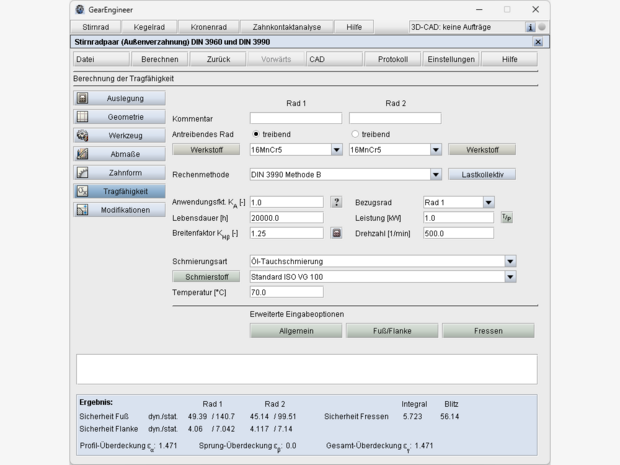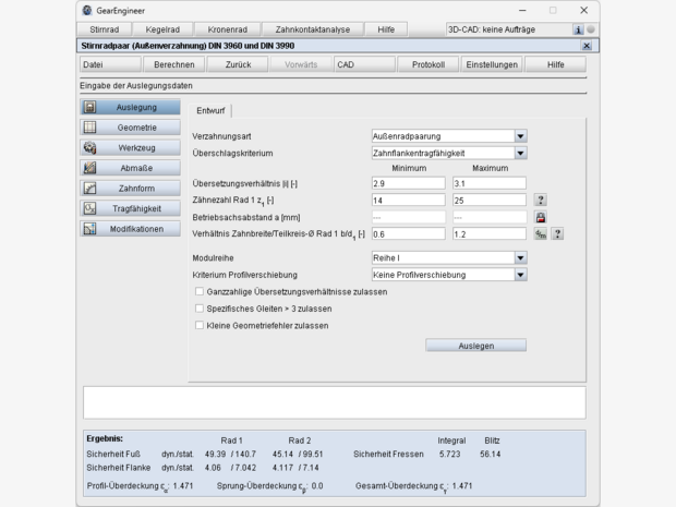 - Berechnung der Sicherheiten für Zeit- und Dauerfestigkeit sowie statische Sicherheit (Zahnfuß, Flanke bzw. Grübchen, Fressen)