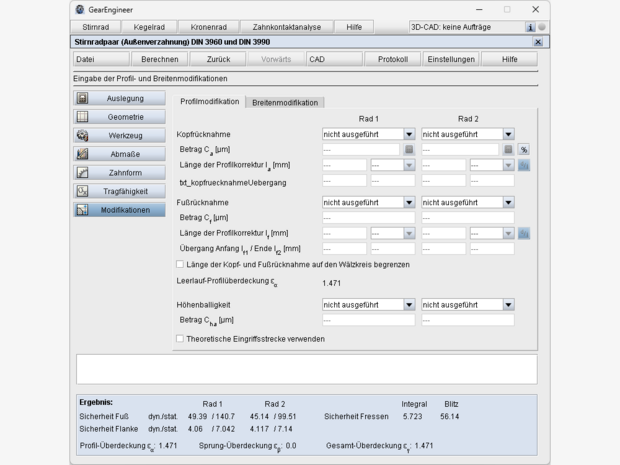 - Vorgabe und Berücksichtigung von Profilmodifikationen in der Zahnform: lineare und kreisförmige Kopfrücknahme, lineare und kreisförmige Fußrücknahme, symmetrische Höhenballigkeit