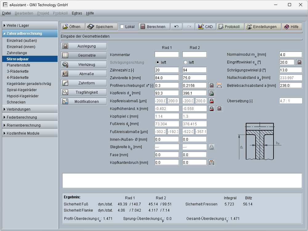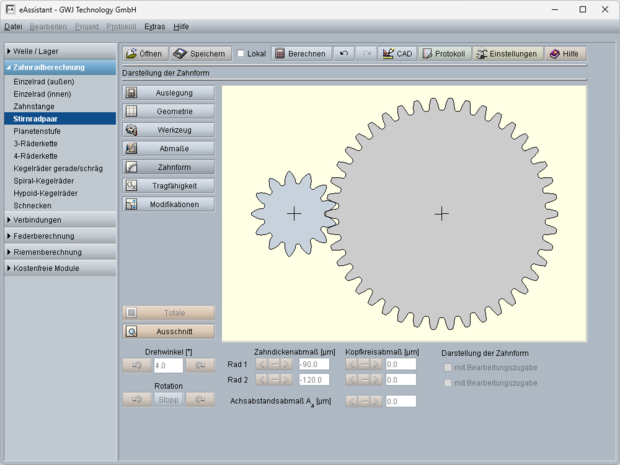 - Benennung am Zahnrad, Hauptgeometriedaten mit Profilverschiebung, Herstellprofilverschiebung, Modul, Eingriffswinkel, Schrägungswinkel, Achsabstände, Teilkreis, Wälzkreis, Kopfhöhenänderung, etc.